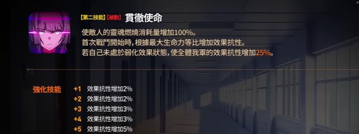 1、被動技能可使敵人靈魂燃燒消耗量增加100%首次戰(zhàn)斗開始時依自身最大生命值提升效果抗性若未處于弱化狀態(tài)則為我方全體提升40%效果抗性。