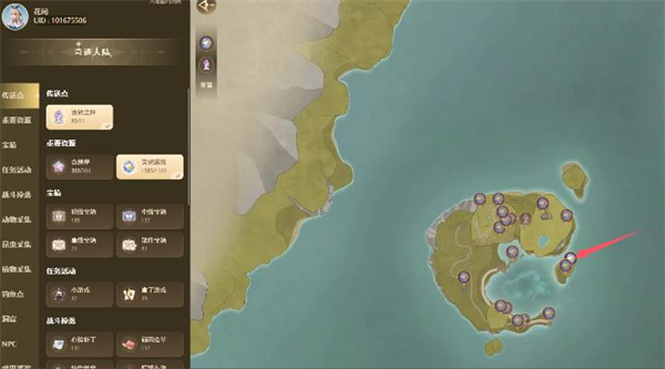 3、綁定游戲賬號后在界面左側(cè)選擇想要查詢的內(nèi)容類別,地圖中呈現(xiàn)發(fā)光狀態(tài)的區(qū)域即為未收集的項目,目前工具支持查詢靈感露珠奇想星和傳送點基本滿足日常查漏需求。
