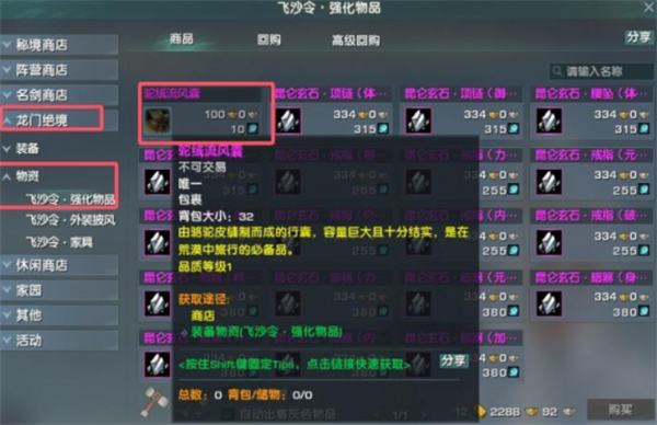 1、參與龍門絕境玩法在對戰(zhàn)中積累飛沙令憑借飛沙令可在龍門絕境商店兌換32格大容量背包該方式無需額外花費資源即可為物品存儲提供充足空間滿足日常收集需求。