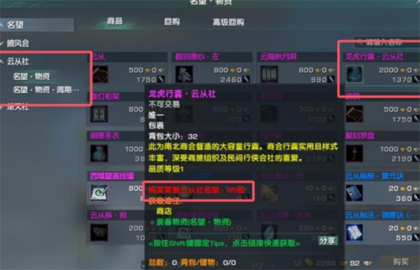 3、提升云從社聲望至云從社聲望商店即可兌換32格的龍虎行囊背包該背包能滿足日常物品存放需求助力俠士在江湖中更便捷地管理物品輕松應對各種冒險。