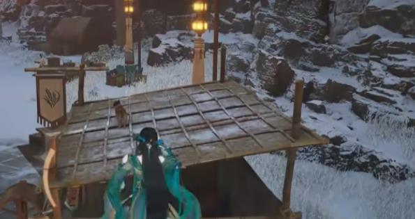 3、前往集市區(qū)域從橋上進(jìn)入,朝集市方向前行至第一個(gè)小店處,仔細(xì)觀察棚子上方可發(fā)現(xiàn)第三只小貓,點(diǎn)擊互動(dòng)完成貓戲3的收集。