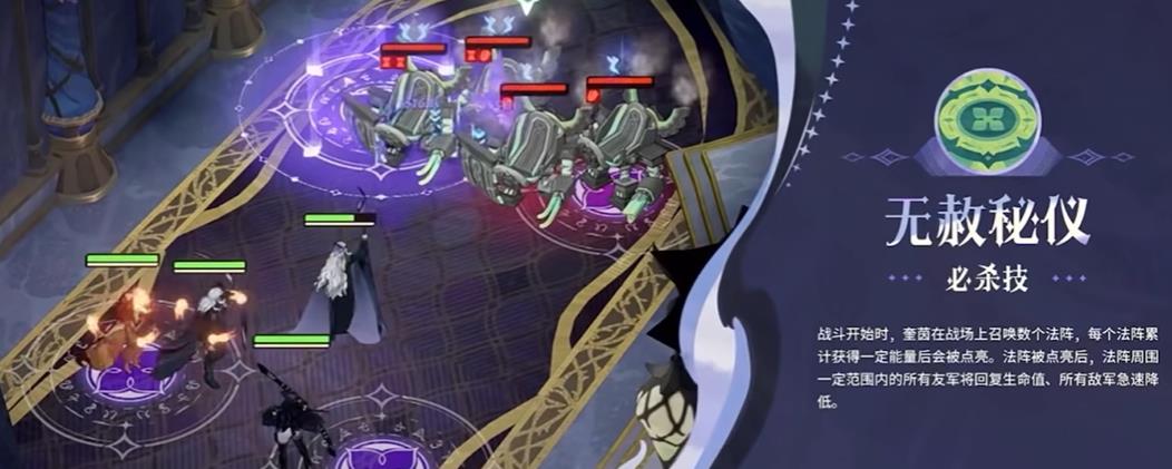 1、無赦秘儀必殺技戰(zhàn)斗開始時,奎茵在戰(zhàn)場上召喚數(shù)個法陣,每個法陣?yán)塾?jì)獲得一定能量后會被點(diǎn)亮。法陣被點(diǎn)亮后法陣周圍一定范圍內(nèi)的所有友軍將回復(fù)生命值所有敵軍急速降低。