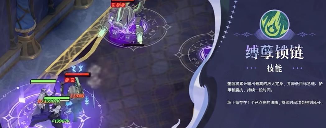 2、縛孽鎖鏈技能奎茵將累計(jì)輸出最高的敵人定身,并降低目標(biāo)急速護(hù)甲和魔抗持續(xù)一段時間。場上每存在1個已點(diǎn)亮的法陣,持續(xù)時間均會得到延長。