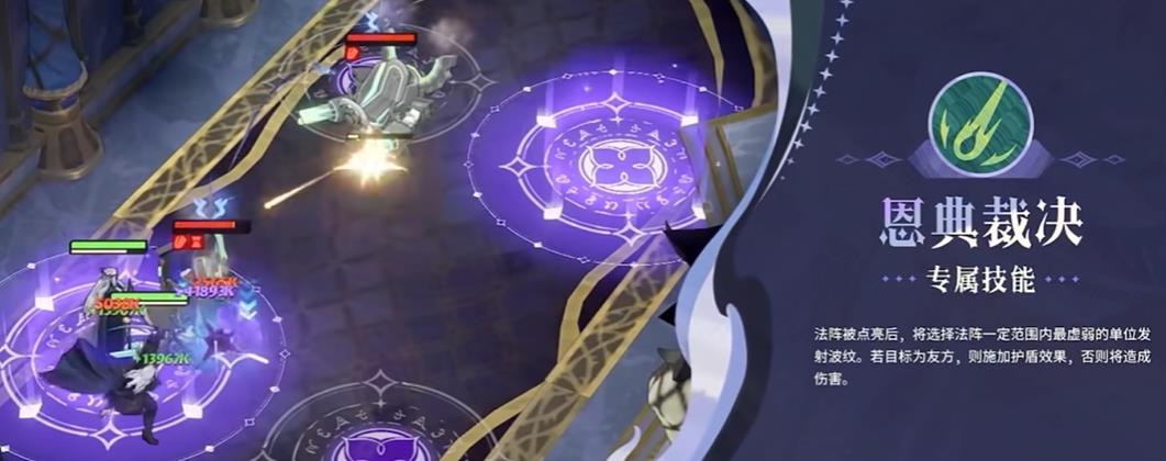 3、恩典裁決專屬技能法陣被點(diǎn)亮后,將選擇法陣一定范圍內(nèi)最虛弱的單位發(fā)射波紋若,目標(biāo)為友方則施加護(hù)盾效果否則將造成傷害。
