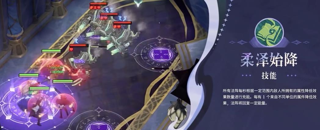 4、柔澤始降技能所有法陣每秒根據(jù)一定范圍內(nèi)敵人所擁有的屬性降低效果數(shù)量進(jìn)行充能。每有1個來自不同單位的屬性降低效果,法陣將回復(fù)一定能量