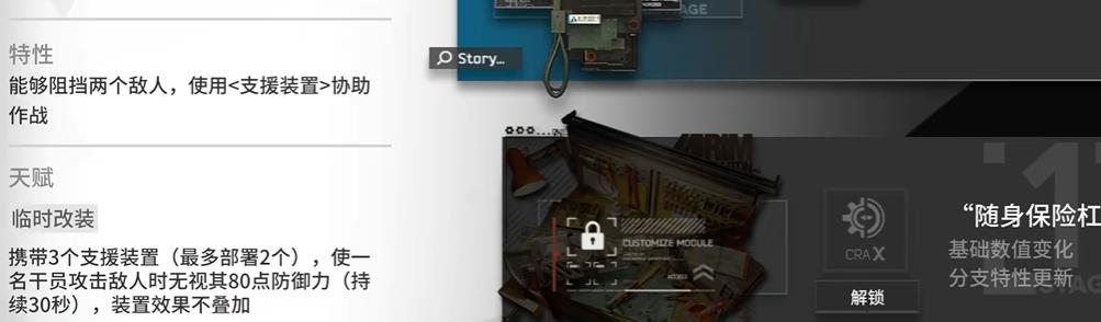 2、天賦效果為攜帶3個(gè)支援裝置最多部署2個(gè),可使一名干員攻擊無(wú)視敵人90至100點(diǎn)防御持續(xù)30秒且效果不疊加,能有效削弱敵方防御提升己方輸出效率。
