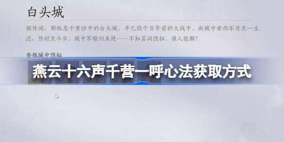 燕云十六聲中千營一呼心法獲取需完成系列任務(wù)流程玩家可通過收集軍旗觸發(fā)劇情參與戰(zhàn)斗等環(huán)節(jié)解鎖該心法。獲取過程包含前置準(zhǔn)備觸發(fā)劇情任務(wù)推進等關(guān)鍵步驟每個環(huán)節(jié)都有具體操作要求需要玩家仔細探索場景應(yīng)對敵人并完成指定動作。接下來將詳細介紹該心法的獲取方式幫助玩家清晰了解每一步操作順利解鎖心法提升角色能力。