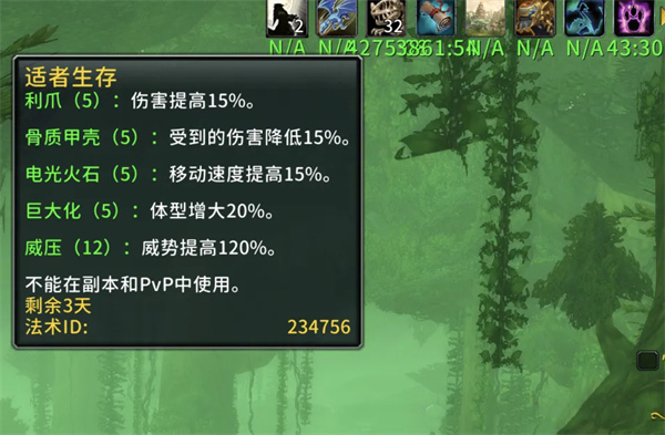 3、不斷與隊(duì)友互相使用恐龍魔精,直至適者生存Buff疊加至20層,此時(shí)系統(tǒng)會(huì)自動(dòng)賦予威壓Buff提升120%威勢(shì),后續(xù)繼續(xù)使用魔精僅疊加威壓效果不再增加前置層數(shù)。