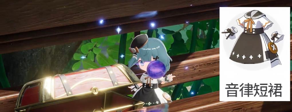 3、音律短裙獲取需找到圖中右下方路牌傳送后向左走發(fā)現(xiàn)紅色寶箱打開即可獲得該服飾為角色下身搭配提供新選擇。