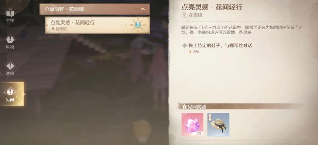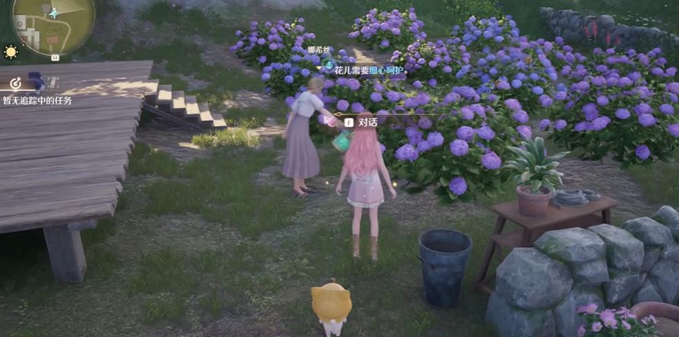 1、任務(wù)觸發(fā)有時(shí)間限制需在晴朗白天5點(diǎn)至21點(diǎn)前往花田找到娜希絲她正為護(hù)花發(fā)愁此時(shí)更換符合要求的服裝能為她帶來靈感從而開啟任務(wù)。