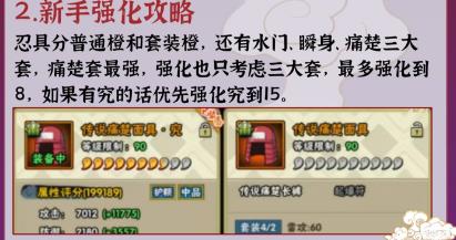 2、忍具分為普通橙和套裝橙其中水門瞬身痛楚三大套裝中痛楚套裝強(qiáng)度最高普通玩家可先將三大套裝強(qiáng)化至8級(jí)若擁有究忍具則優(yōu)先強(qiáng)化到15級(jí)以發(fā)揮更強(qiáng)戰(zhàn)力。