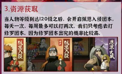 3、人物等級(jí)達(dá)到120級(jí)后開(kāi)啟佩恩入侵團(tuán)本每日可參與一次每周最多兩次建議挑戰(zhàn)修羅團(tuán)本因其產(chǎn)出究忍具的概率較高是獲取優(yōu)質(zhì)忍具資源的重要途徑可助力玩家更快提升裝備品質(zhì)。