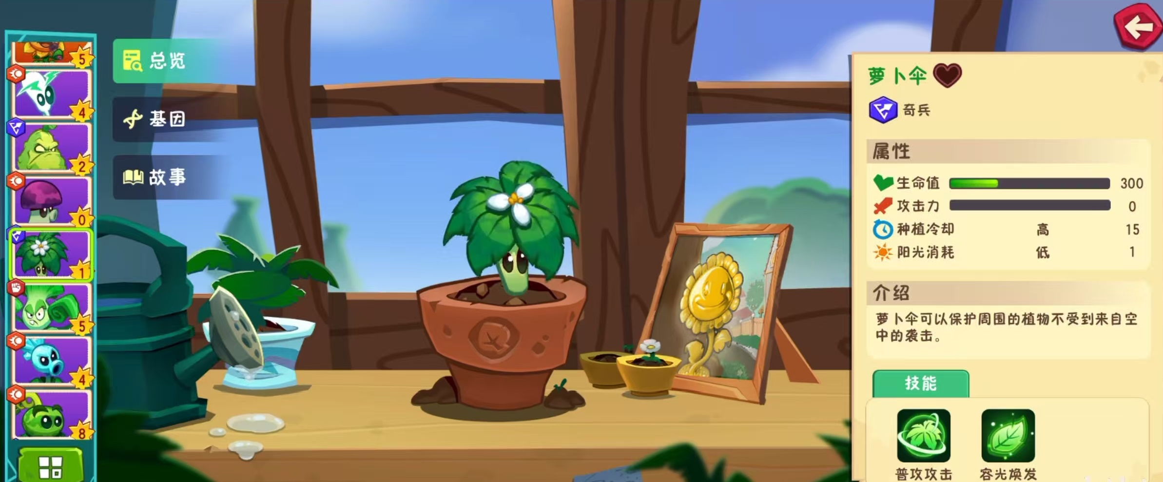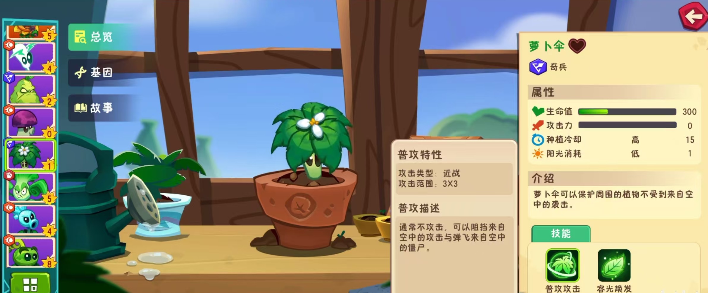 1、蘿卜傘核心能力是守護周圍功能性植物與輸出植物,使其免受空中攻擊威脅,在存在飛行僵尸或高空拋物僵尸的關(guān)卡中,能為其他植物創(chuàng)造安全的輸出環(huán)境。