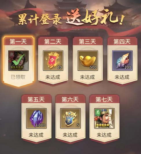 2、開(kāi)服設(shè)有累計(jì)登錄活動(dòng)首日贈(zèng)送S+神將甄姬次日提供十連抽機(jī)會(huì)第七日可領(lǐng)取麒麟諸葛每次登錄還能獲得養(yǎng)成道具助力武將成長(zhǎng)。