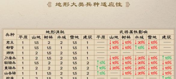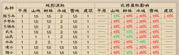 2、地形對兵種屬性影響顯著,平原地形可小幅提升騎兵各項屬性,山地環(huán)境中短弓兵屬性有所增強而其他兵種屬性普遍下降,需依地形選擇出戰(zhàn)兵種。