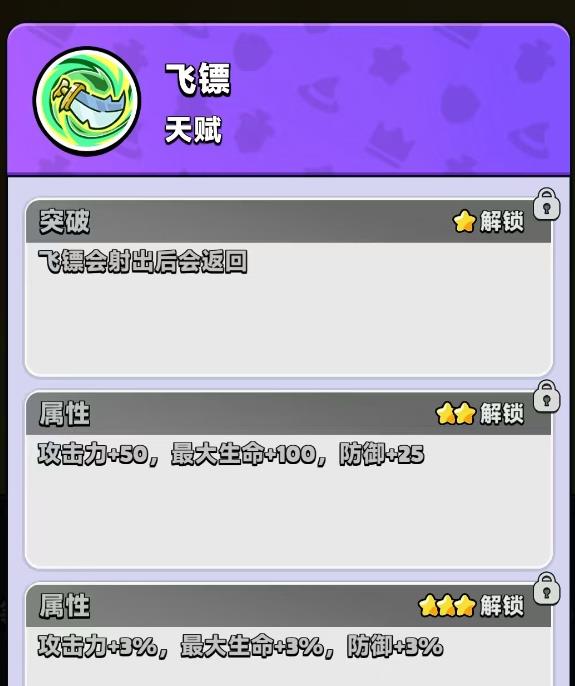 1、貓刺客主要技能為飛鏢可朝最近敵人發(fā)射,解鎖天賦后飛鏢會返回造成二次傷害,數(shù)量傷害擊退效果均提升,滿星時飛鏢數(shù)量多擊退強(qiáng)實(shí)戰(zhàn)強(qiáng)度高。