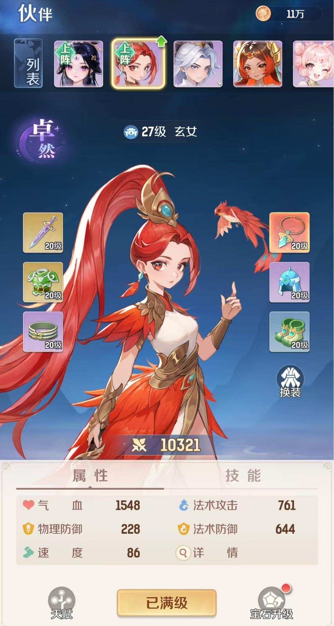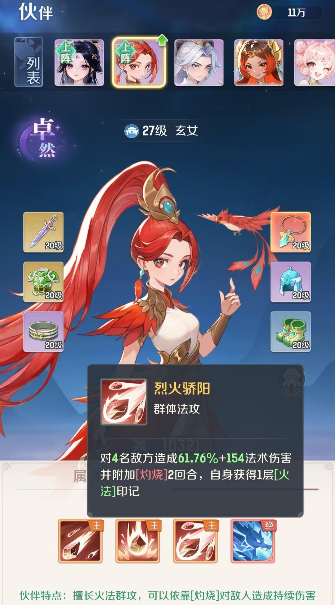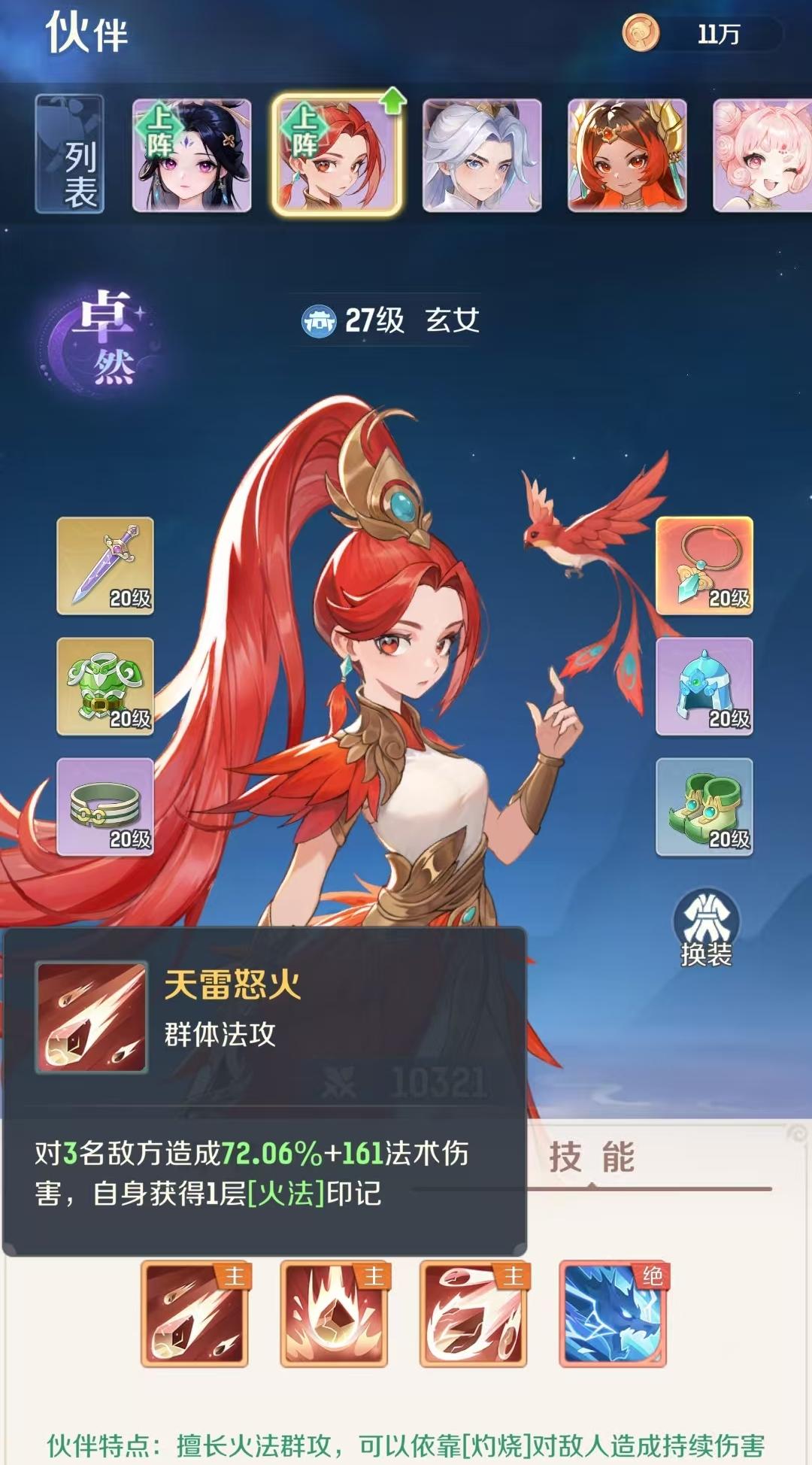 1、玄女屬魔法群攻型伙伴,可借灼燒對敵人造成持續(xù)傷害,主動(dòng)技能有天雷怒火三味真火烈火驕陽,分別能對3名5名4名敵人造成法術(shù)傷害,自身還會(huì)獲得火法印記。
