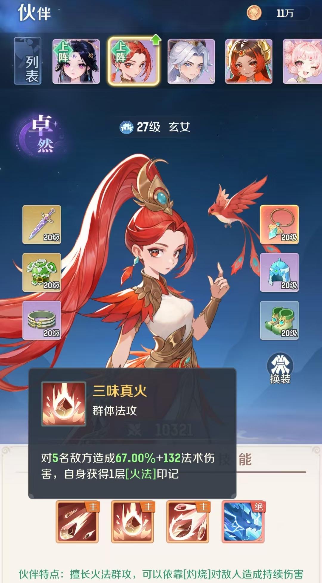 1、玄女屬魔法群攻型伙伴,可借灼燒對敵人造成持續(xù)傷害,主動技能有天雷怒火三味真火烈火驕陽,分別能對3名5名4名敵人造成法術傷害,自身還會獲得火法印記。