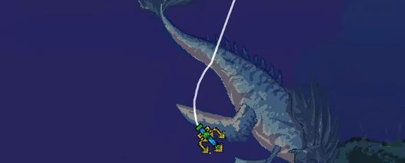 2、捕獲前將魚竿和魚鉤升滿級,使用龍脊魚竿魚線長度621M和永恒之槍魚鉤傷害60。下鉤按住屏幕加速下沉滑動屏幕左右躲避50-300米深度的小魚群,確保有足夠空間撈上利維坦。