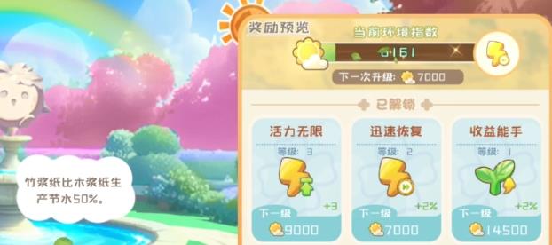 2、提升環(huán)境指數(shù)數(shù)值能解鎖對應獎勵,如指數(shù)達7000解鎖1級獎勵加速經驗收取,達9000升2級獲更快加速,同時還能促進祈愿池升級獲取更高級合成道具。