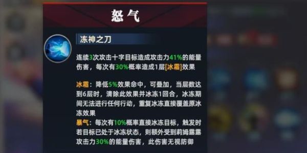 2、怒氣技能三次攻擊十字目標(biāo)造成能量傷害,每次有30%幾率造成冰霜,爆氣時(shí)有10%幾率冰凍目標(biāo),已冰凍則造成額外傷害,冰霜疊加六層可觸發(fā)冰凍控制。