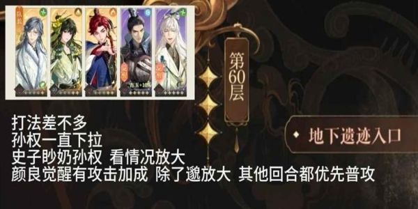 如鳶的極樂地宮挑戰(zhàn)中,60層是眾多玩家的攔路虎,而劉辯隊(duì)卻能在此展現(xiàn)獨(dú)特優(yōu)勢(shì),此關(guān)卡敵人攻擊模式多樣,從阿蟬的連擊到張遼的定點(diǎn)打擊,都極具威脅,想要達(dá)成三星通關(guān),不僅要了解敵人機(jī)制,更要合理搭配角色與命盤,接下來,將從關(guān)卡機(jī)制、陣容搭配與具體打法三個(gè)維度,為你深度解析劉辯隊(duì)三星通關(guān)60層的攻略要點(diǎn)。