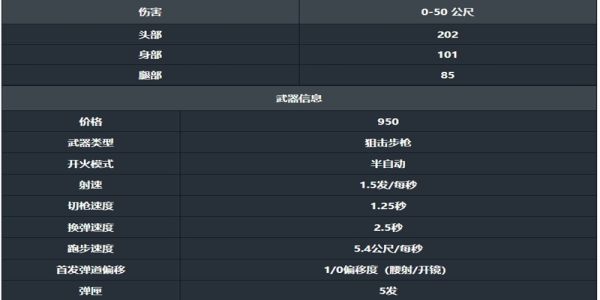1、飛將基礎(chǔ)屬性售價950游戲幣,0-50米內(nèi)頭部傷害202點身體101點腿部85點,半自動射擊射速每秒1點5發(fā),持槍移動速度每秒5點4米,裝備時間1點25秒性價比適合中距離作戰(zhàn)。