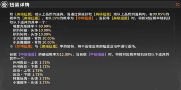 1、扭蛋分珍稀和高級兩種類型,高級扭蛋獲取概率百分之九十九點八五,可獲喵露克斯臻享卡趴趴阿貓頭飾等道具,珍稀扭蛋獲取概率百分之零點一五,得限定裝備且后續(xù)不返場。