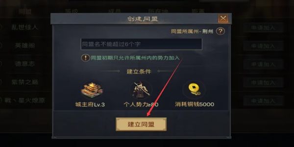 2、達成條件后在游戲界面找到創(chuàng)建入口,為同盟取一個3到6字符的專屬名稱,新成立同盟初期只能招募本州玩家,想吸納其他州成員,先在對應州征服至少一座城池,拓展勢力范圍。
