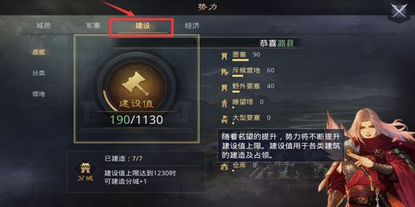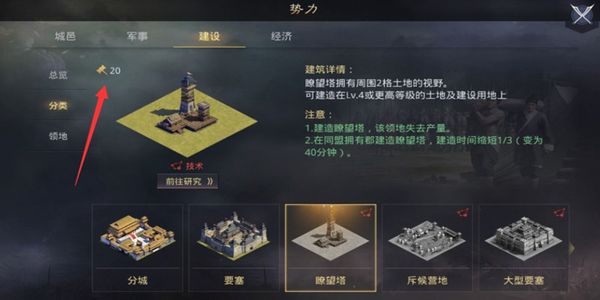 3、各類建筑會消耗建設(shè)值,如自建要塞需15點,占領(lǐng)荒野要塞耗20點,軍營需25點,不足時無法新建建筑或占領(lǐng)設(shè)施,可在建設(shè)菜單查看具體消耗。