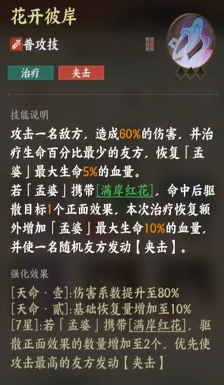 1、普攻技攻擊敵方造成60%傷害,治療生命百分比最少的友方恢復(fù)孟婆最大生命5%血量,攜帶滿(mǎn)岸紅花時(shí)驅(qū)散目標(biāo)1個(gè)正面效果,治療量增加并使隨機(jī)友方夾擊,強(qiáng)化提升技能效果。