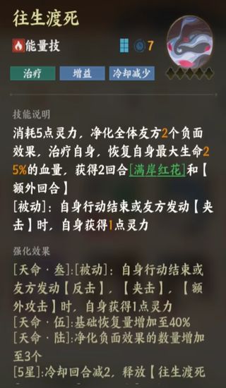 3、能量技往生渡死消耗5點(diǎn)靈力,凈化全體友方2個(gè)負(fù)面效果,治療自身恢復(fù)最大生命25%血量,獲2回合滿(mǎn)岸紅花和額外回合,被動(dòng)獲靈力,強(qiáng)化后提升凈化數(shù)、治療量并減冷卻。