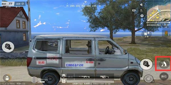 1、首先裝備槍支和彈藥,靠近車輛選乘坐,可見探頭射擊按鈕,以面包車為例,點(diǎn)擊右側(cè)按鈕,角色探出,屏幕出現(xiàn)準(zhǔn)星,點(diǎn)射擊鍵開火,再點(diǎn)收回身體。