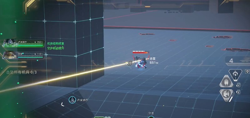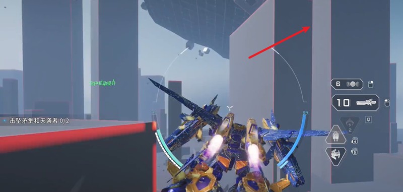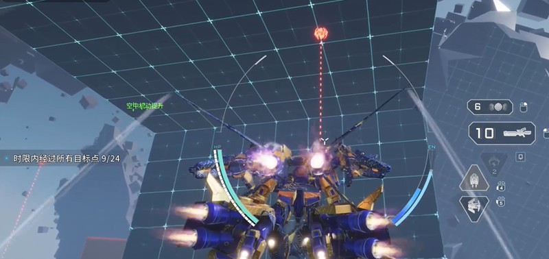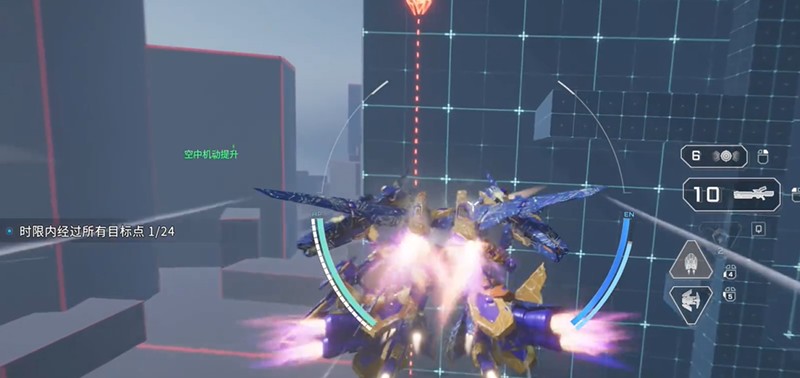 1、第一關(guān)考驗機動性,玩家要巧用沖刺與攀升技能,也可關(guān)閉七條技能實現(xiàn)垂直墜落,借此爬到更高處或從下方直接上升,靈活穿梭躲避攻擊,對目標發(fā)起攻擊。