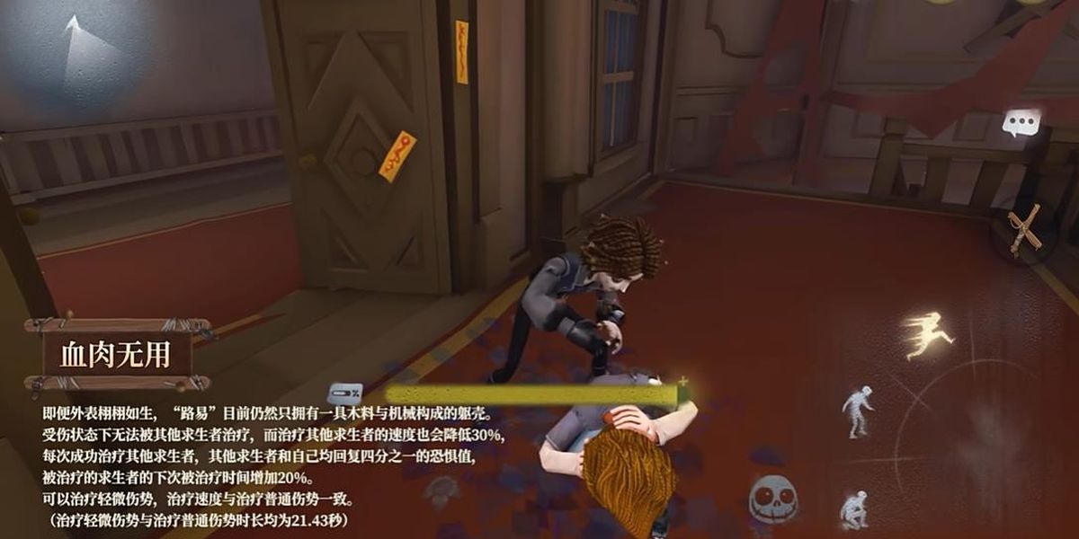 4、血肉無用是治療特性,受傷時無法接受治療,治療其他求生者時速度降低30%,但每次成功治療后,雙方都能恢復(fù)25%恐懼值,對團隊協(xié)作有幫助。