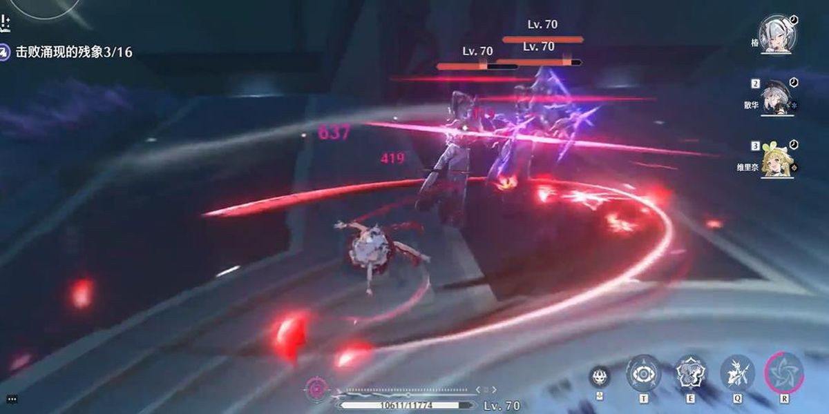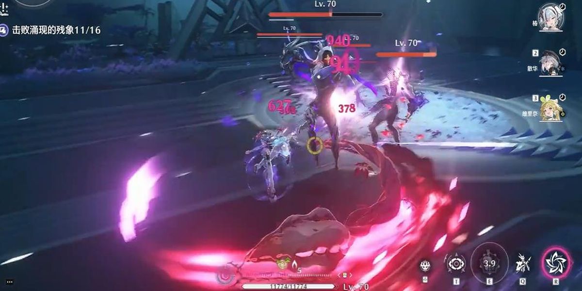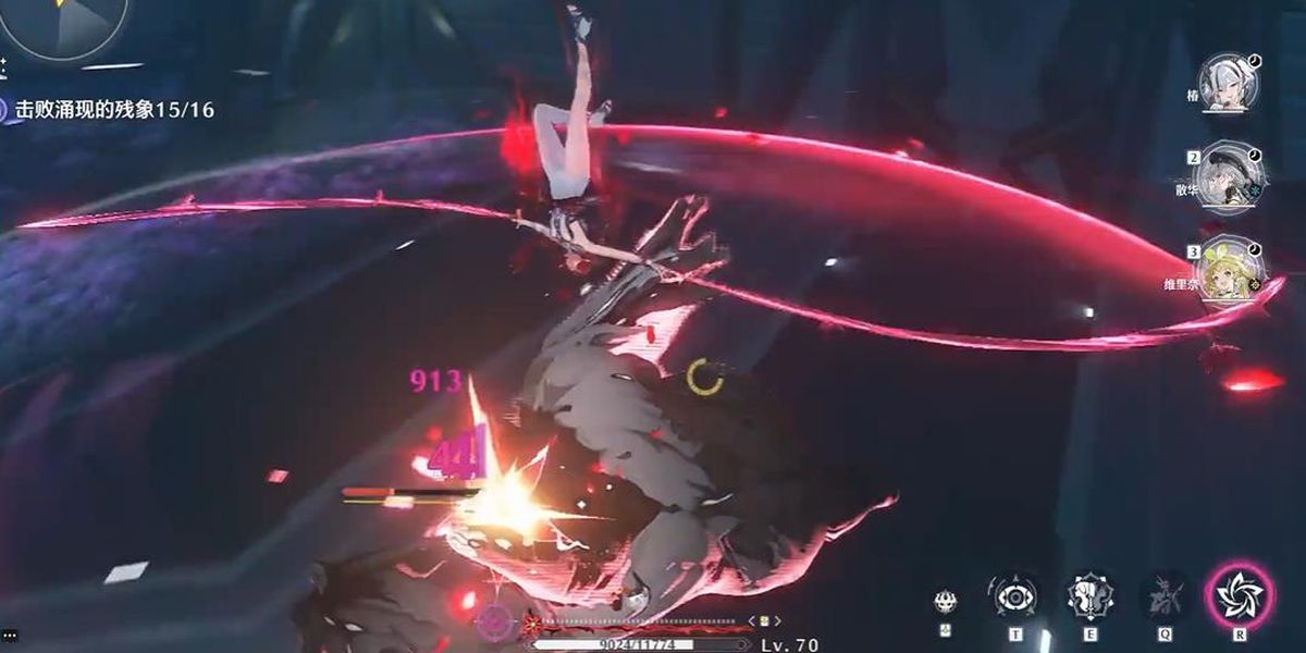 2、共鳴技能核心輸出手段,地面使用召喚魔女手臂抓取敵人造成范圍湮滅傷害,可充能兩次,空中使用變?yōu)榛匦?,造范圍傷害并恢?fù)耐力,共鳴解放釋放多段湮滅傷害,具毀滅性。