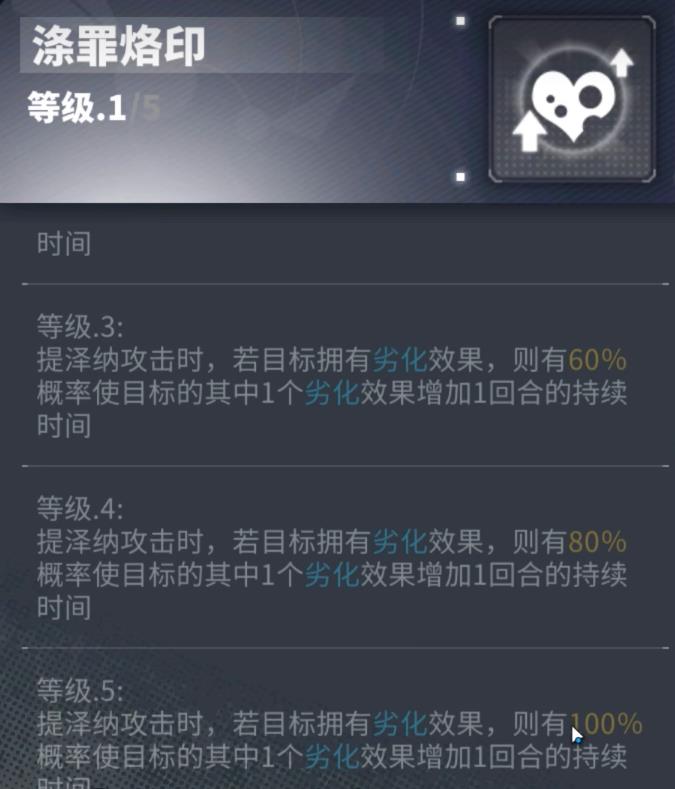 3、滌罪烙印天賦極具戰(zhàn)略價值,當她攻擊帶有劣化效果的敵人時,有不小概率延長負面狀態(tài)持續(xù)時間,從而為團隊創(chuàng)造更有利的作戰(zhàn)環(huán)境。