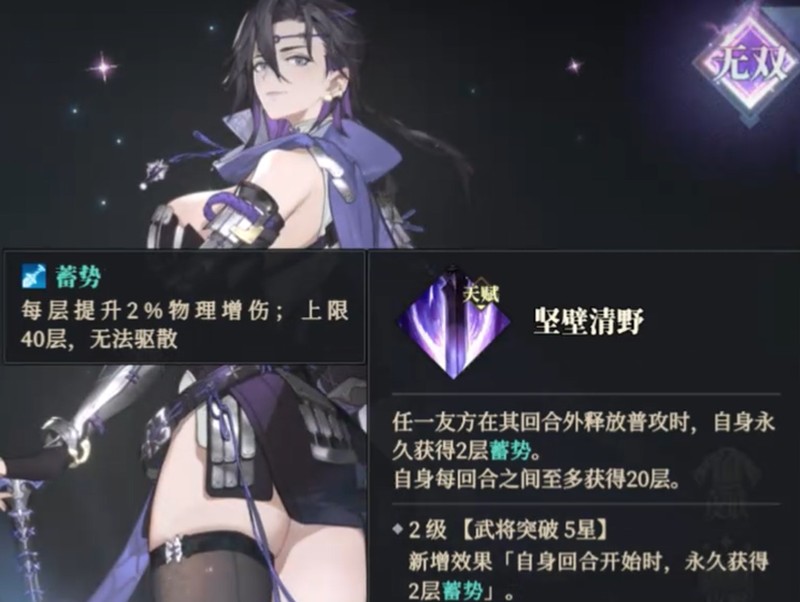 1、核心機制是蓄勢疊加,在每個回合結(jié)束時會穩(wěn)定獲得蓄勢,每層蓄勢能為自身提升2%的物理增傷效果,且蓄勢上限為40層,一旦獲得便不可被驅(qū)散。