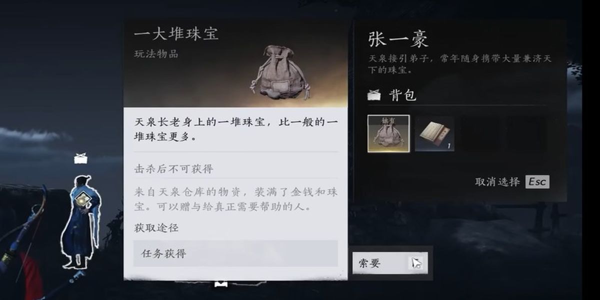1、前往豐禾村,找到店小二對話觸發(fā)天泉派相關(guān)任務(wù)線,接受天全長老委托去找張一豪討要珠寶,擊敗張一豪后獲得珠寶,交給天全長老即可獲得不義之財(cái)作為獎(jiǎng)勵(lì)。