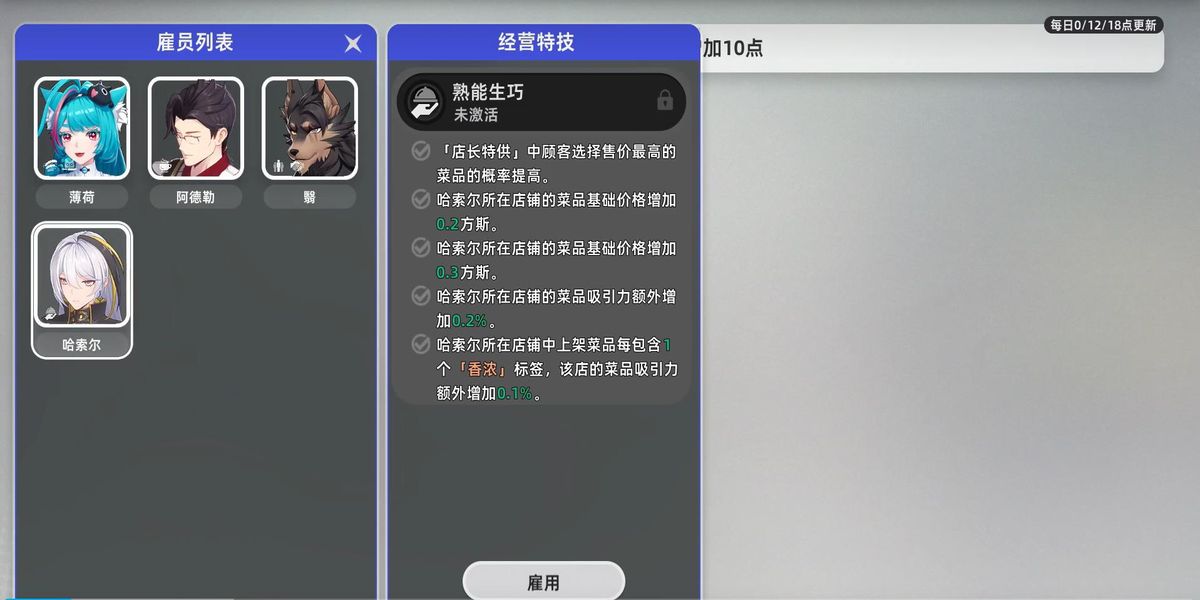 4、店鋪經(jīng)營中有30多個不同關卡,每個關卡可雇傭具有特殊能力的員工,如加快食材處理速度或延長顧客等待時間,合理利用員工能力能輔助菜譜制作和銷售,提升店鋪效益。