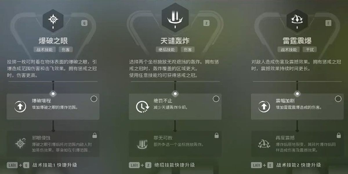 4、大招天譴轟炸升級分兩階段,第一次選多重打擊增加轟炸點(diǎn)數(shù)量,第二次選煉獄焦土擴(kuò)大范圍,使用時需預(yù)判位置,空地覆蓋中心,房區(qū)封鎖門窗。