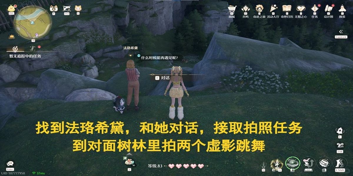 1、先傳送到廢棄瘋愿之子營地錨點,追蹤任務(wù)后找到法珞希黛,與其對話接取拍照任務(wù),明確需拍攝對面樹林里兩個虛影跳舞的畫面,對話時要仔細(xì)聽清任務(wù)細(xì)節(jié)避免遺漏關(guān)鍵信息。