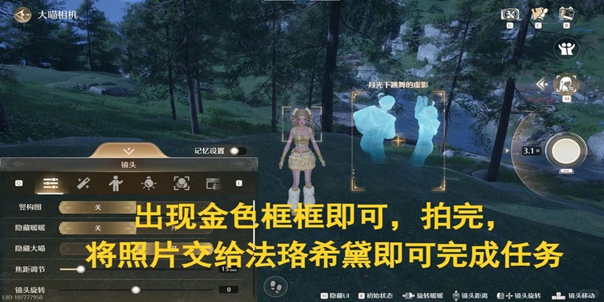 2、跟隨指引前往對面樹林,注意拍攝需在夜晚22點到4點進行,要捕捉月光下兩個虛影跳舞的場景,出現(xiàn)金色框時點擊拍照,此時要穩(wěn)住鏡頭確保畫面清晰完整。