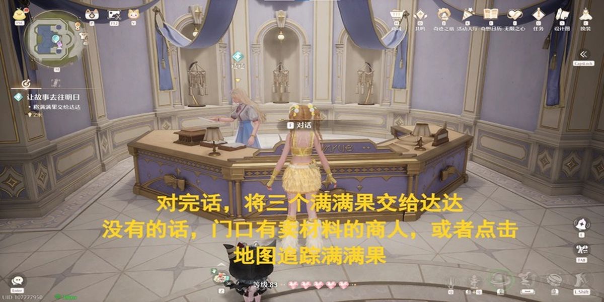 1、接取任務后追蹤并傳送至巨蛇遺跡錨點,向后轉找到菲比對話,隨后前往搭配師協(xié)會向達達申請場地,需將滿滿果交給達達,無滿滿果可追蹤獲取或在協(xié)會門口廣場大樹花壇尋找。
