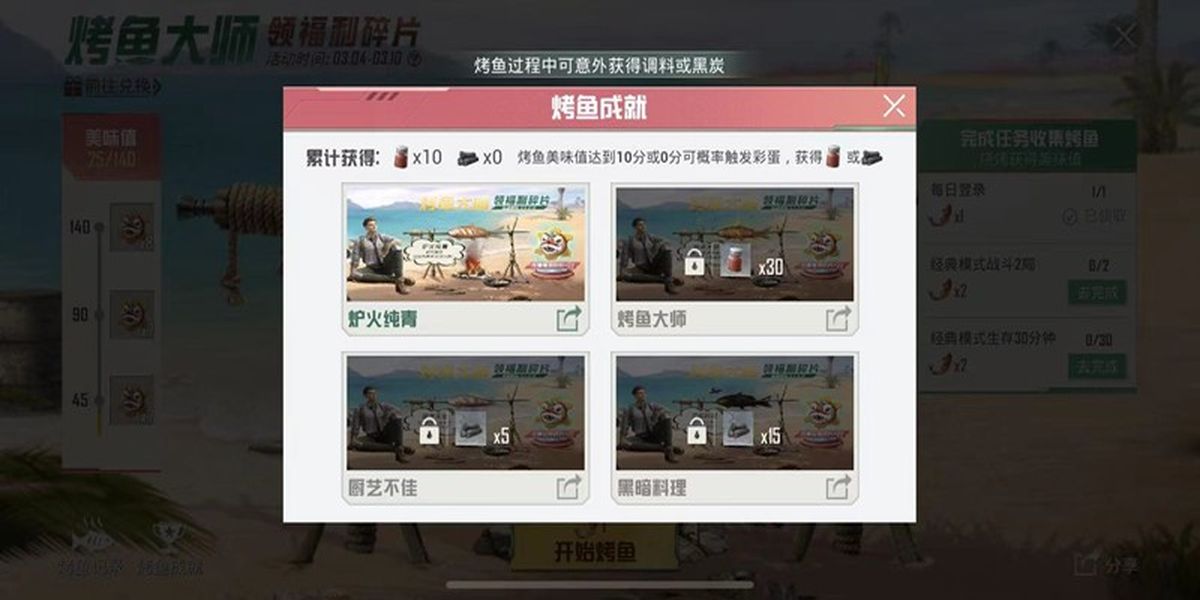 1、爐火純青成就需在烤魚時(shí)達(dá)到完美的10分評(píng)分,要掌握火候控制,當(dāng)指針移動(dòng)到完美區(qū)域時(shí)及時(shí)點(diǎn)擊完成烤制,成功一次即可解鎖該成就。