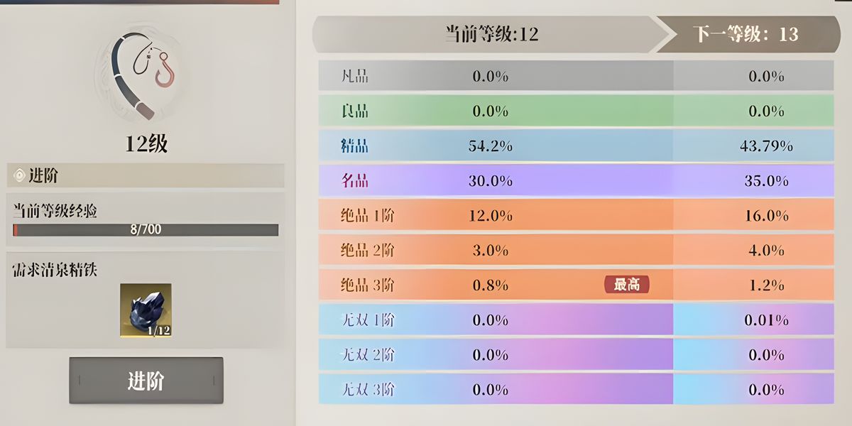 3、裝備品質(zhì)與漁弋等級密切相關(guān),從凡品到無雙三階,等級越高獲得高品質(zhì)裝備的概率越大,提升等級需達(dá)成一定釣魚次數(shù)并消耗清泉精鐵進(jìn)階,清泉精鐵主要通過試煉兵械庫獲得。