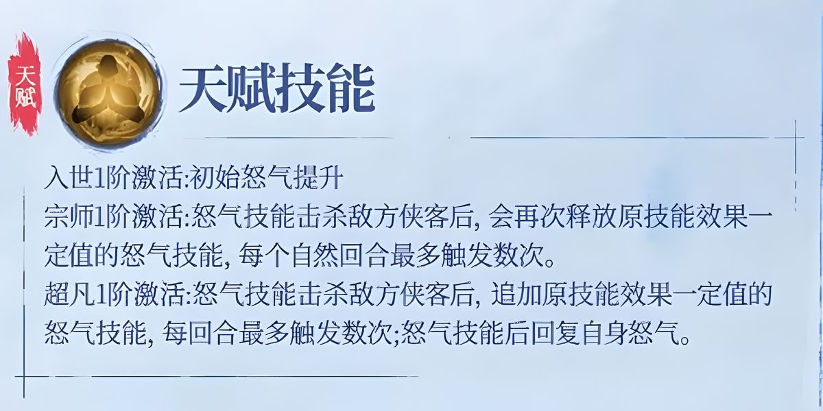 3、天賦系統(tǒng)在不同階段解鎖不同效果,入世1階激活初始怒氣提升,宗師1階激活怒氣技能擊殺后再次釋放一定值效果,超凡1階激活追加效果與怒氣回復(fù),全方位強(qiáng)化持續(xù)作戰(zhàn)能力。