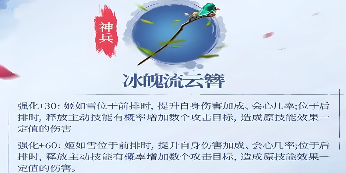 4、專屬神兵冰魄流云簪強(qiáng)化至加30,前排提升傷害和會(huì)心幾率,后排釋放主動(dòng)技能有概率增加攻擊目標(biāo),能靈活適應(yīng)不同戰(zhàn)斗場景,無論前后排都能發(fā)揮出色,提升了角色的適應(yīng)性。