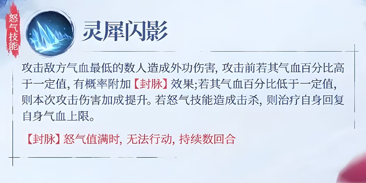 1、怒氣技能靈犀閃影,攻擊敵方氣血最低的數(shù)人造成外功傷害,目標(biāo)氣血高于一定值有概率附加封脈效果,低于一定值則傷害加成提升,若造成擊殺能治療自身回復(fù)氣血上限。