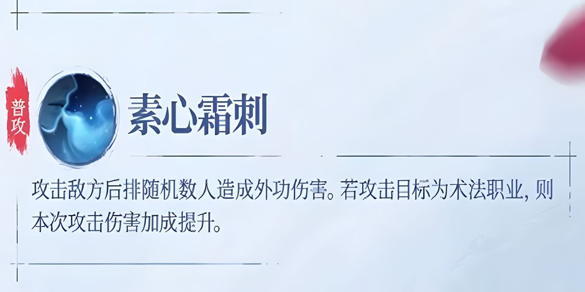 2、普攻技能素心霜刺,攻擊敵方后排隨機(jī)數(shù)人造成外功傷害,攻擊目標(biāo)為術(shù)法職業(yè)時(shí)傷害加成提升,能有效針對(duì)后排輸出單位,對(duì)術(shù)法職業(yè)有明顯克制作用,增強(qiáng)了對(duì)戰(zhàn)的針對(duì)性。